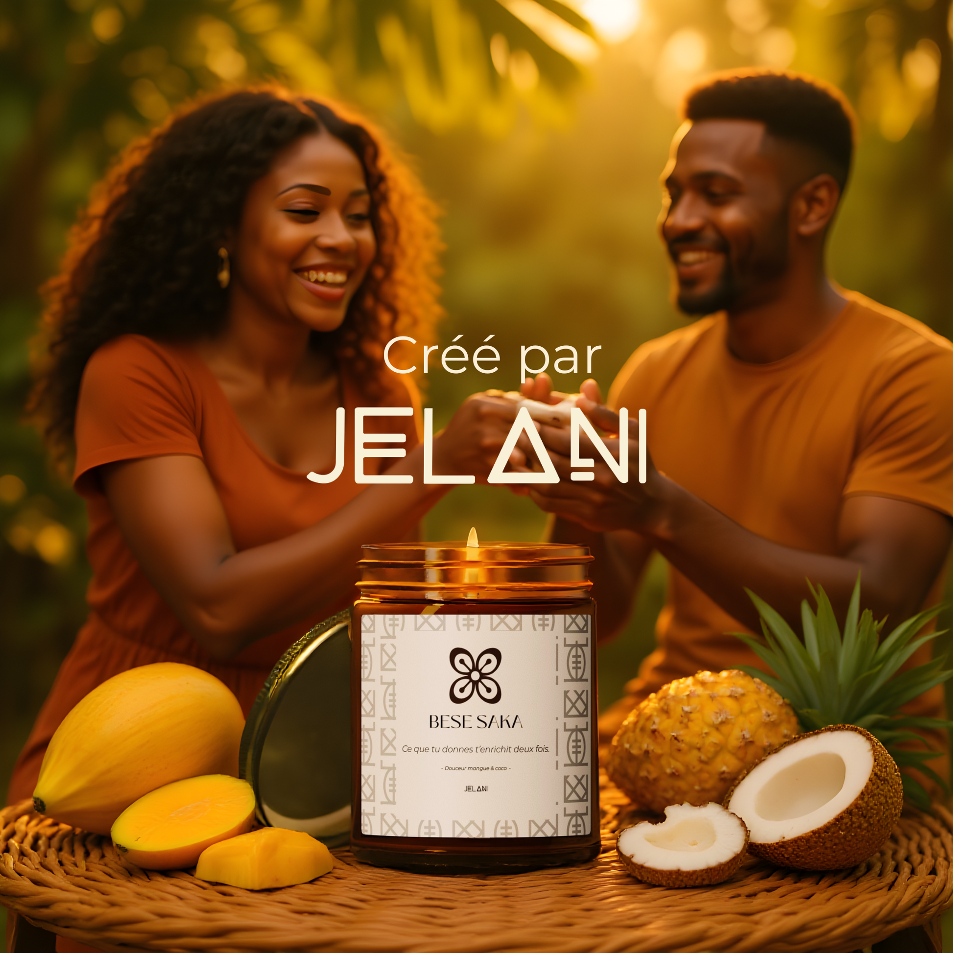 - Une fragrance Mangue & Coco douce, exotique porté par le symbole Adinkra Bese Saka, associé à l’abondance et à la prospérité,